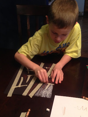 When I saw this art project on Facebook last week I knew we had to do it! I love cardinals and think they are so beautiful. We have a cardinal that comes to visit us often during the winter. We love when he lands on our snow covered bushes in the backyard. His bright red color really pops on the white snow. This project reminded me of that except instead of him sitting on snowy trees, he's in a dark winter forest. Which I think is so very cool.